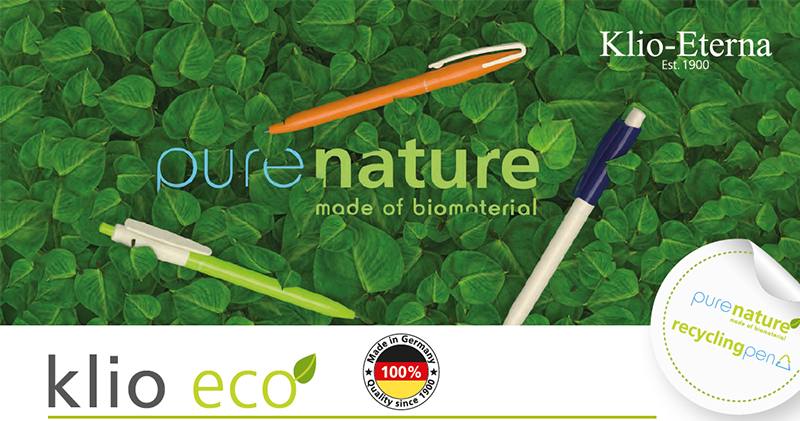 Die Marke klio eco steht für umweltbewusstes Handeln und nachhaltige Produktion im Hause Klio-Eterna. Die „grüne“ Marke umfasst neben Schreibgeräten aus nachwachsenden Rohstoffen ebenso Modelle aus recyceltem Basismaterial. Unterschieden werden die eco-Produkte in die Kategorien ECO und Recycling, denen jeweils verschiedene Konzepte und Produktionsprozesse zugrunde liegen.